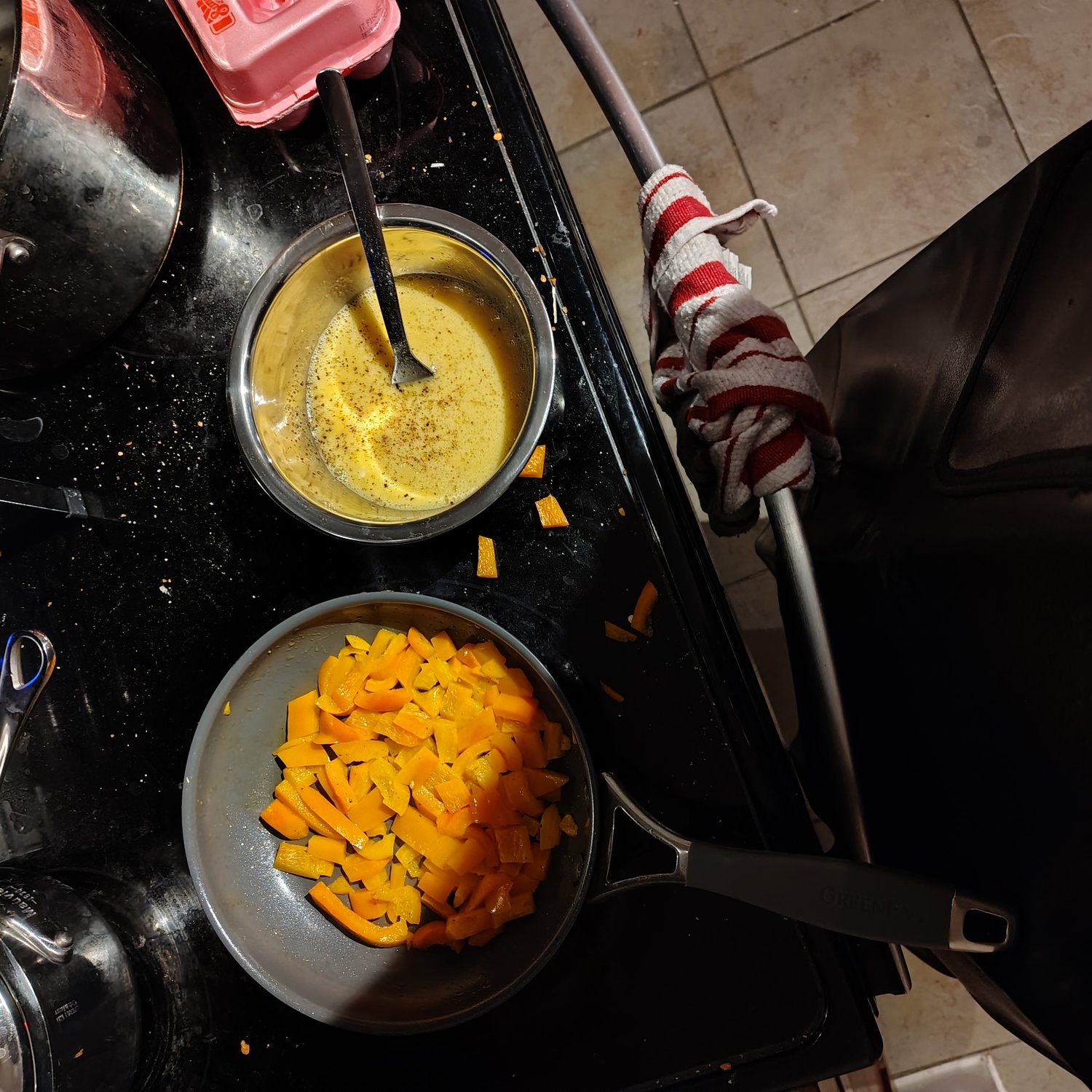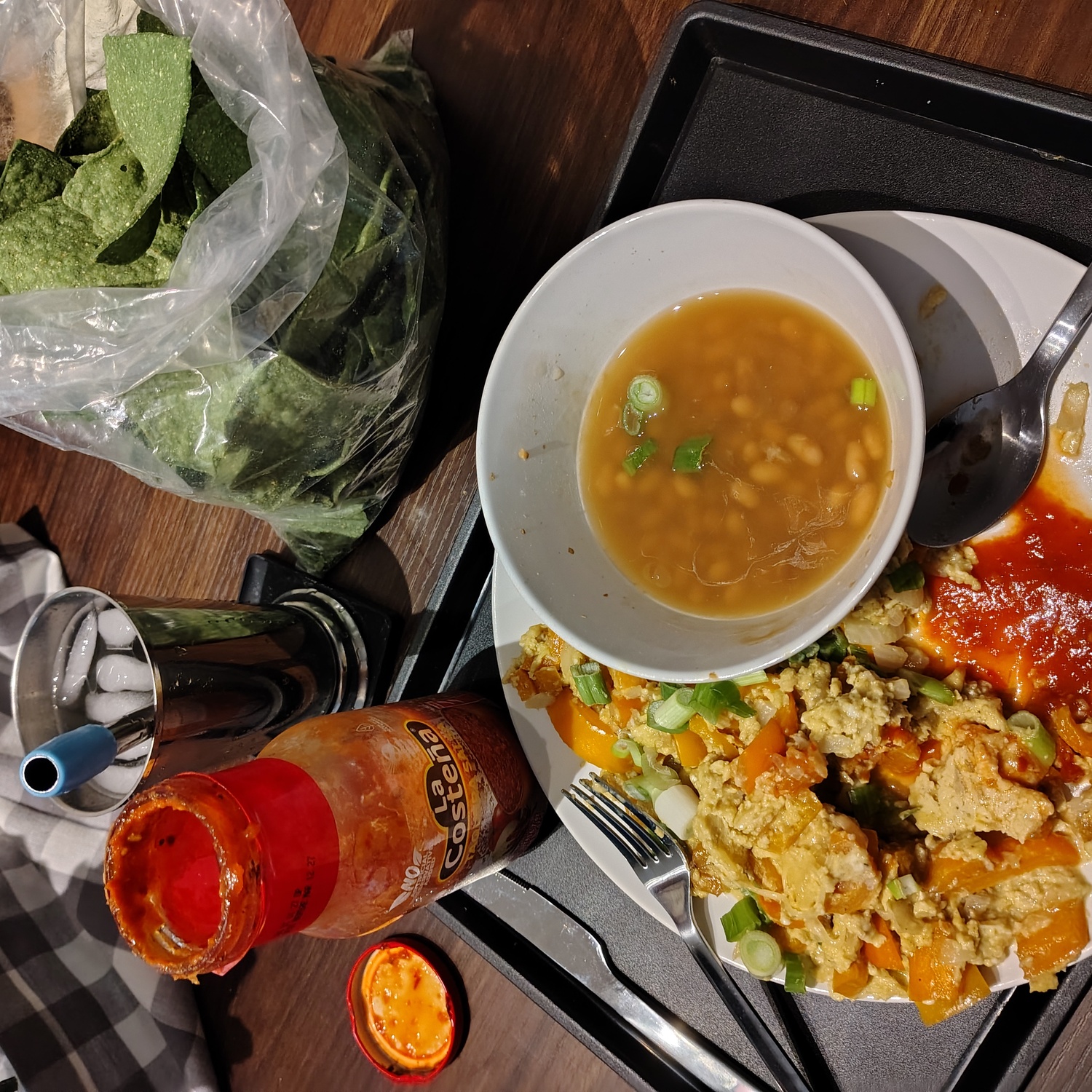 Onion peppers Parm cheese, some leftover beans, green onion and nopales chips