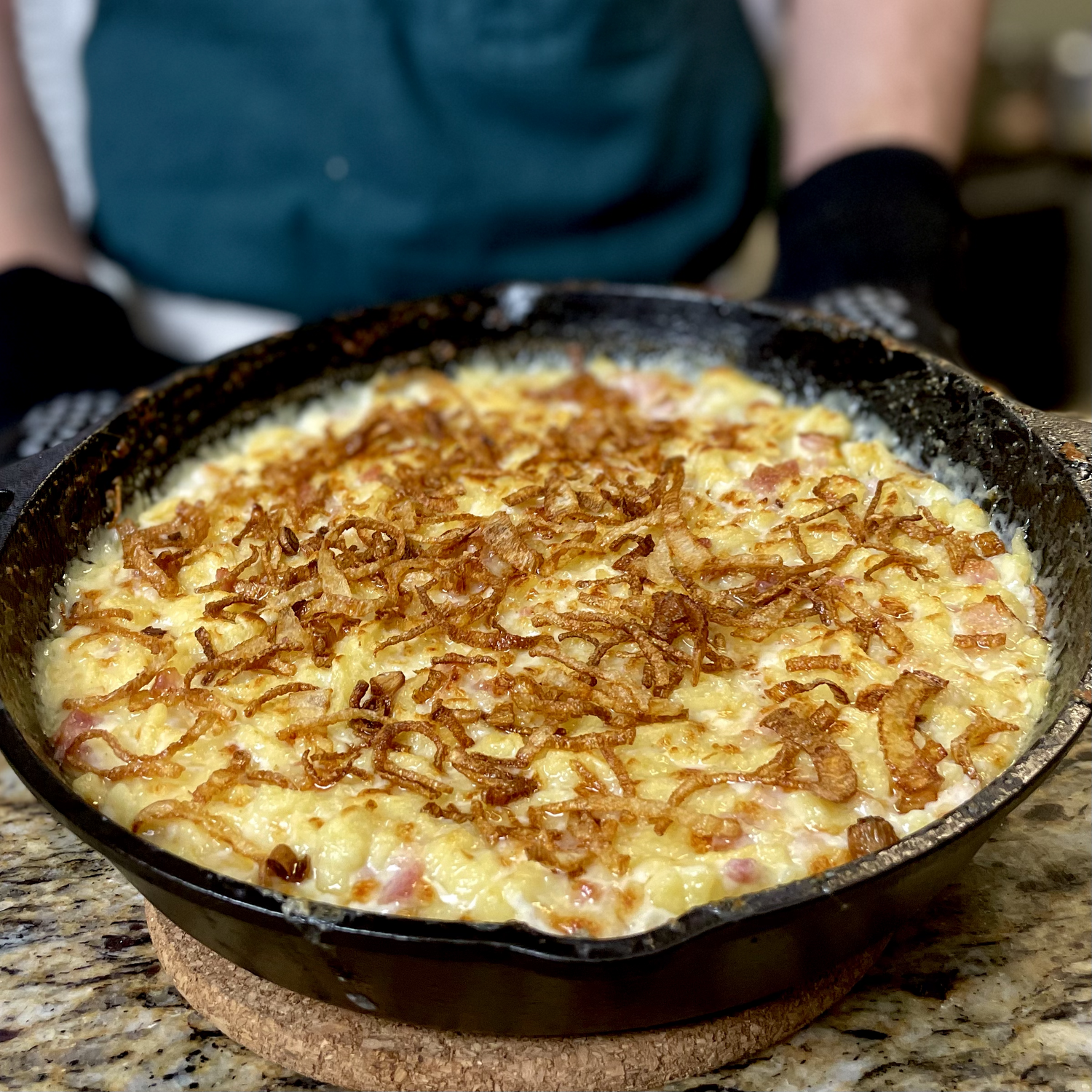 Cut the Bacon slices into small stripes and roast them for a few minutes before you add the 1/2 diced onion to the pan ( I recommend using a cast iron pan)After the Onions are soft and the bacon is almost crispy you are going to add some butter and the spaetzle. Saute it for a few minutes until the access water is gone.Slowly add the Cheese in several batches. As oosn as the first batch is melted add the heavy cream to the speatzle. As soon as it is incorporated nicely add the left over cheese.Stir frequently until everything i smelted and nicely combined.Depending on the cheese you used, you might have to season the Spaetzle as well ( salt, Peper, Nutmeg...) whatever you likePut the pan into the broiler for 5 minutes until golden brownTopp it off with the crispy onionsEnjoy your homemade Spaetzle