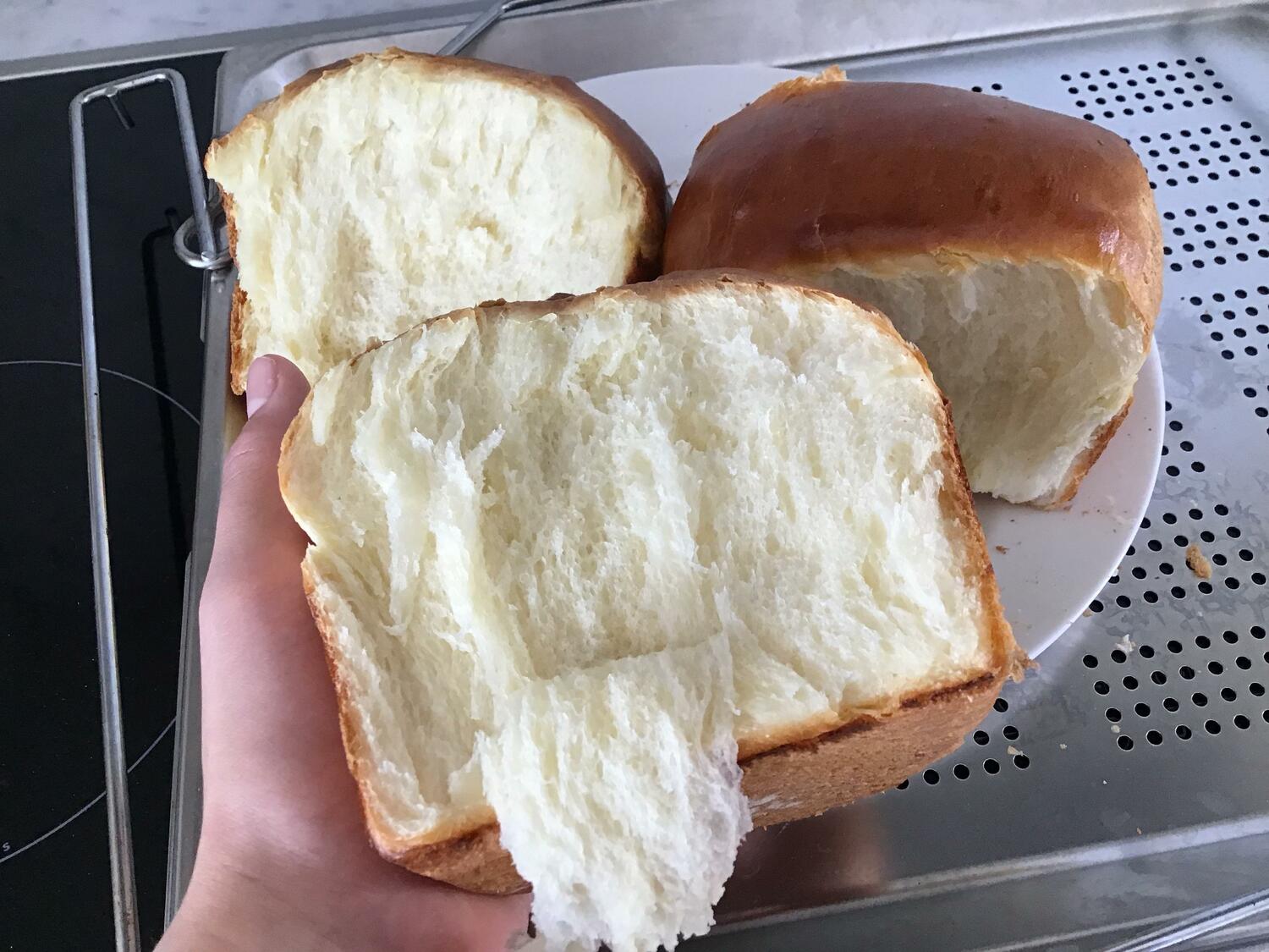 Start by combining flour, sugar and salt together. Mix with a spatula. Add boiling water and slowly incorporatenow microwave some cold milk for 30 seconds. add yeast and mix. pour into the flour and water mixture. add eggs and mix. the dough should be very sticky. DO NOT add more flour. Rest for 20 mins with a lid onafter you have rested add oil. Oil should make the dough no sticky. Knead the dough until the oil in incorporated and it is sticky again. Cover and rest for 1 hour.after one hour, punch the dough with floured hands until you have let most of the air out. It should be about the size of the dough before resting. Now, split into three pieces. flour a surface and roll it out. fold both ways in. then, smooth side down, roll it out with a pin. With your hands, roll it into a roll ( sorry, is this confusing?) and place into a prepared bread tin. This is optional. If you want to just place all the pieces into the bread tin. but doing that will help the bread have more layers and fluffiness. rest in bread tin for 1 hour.now, make your egg wash by combing all ingredients and mixi with a whisk. using a brush bush a thin layer on. cook at 190C for 30 mins. take out and cool for 5 mins.. You can split them open with your hands or cut with a knife. Enjoy!!!