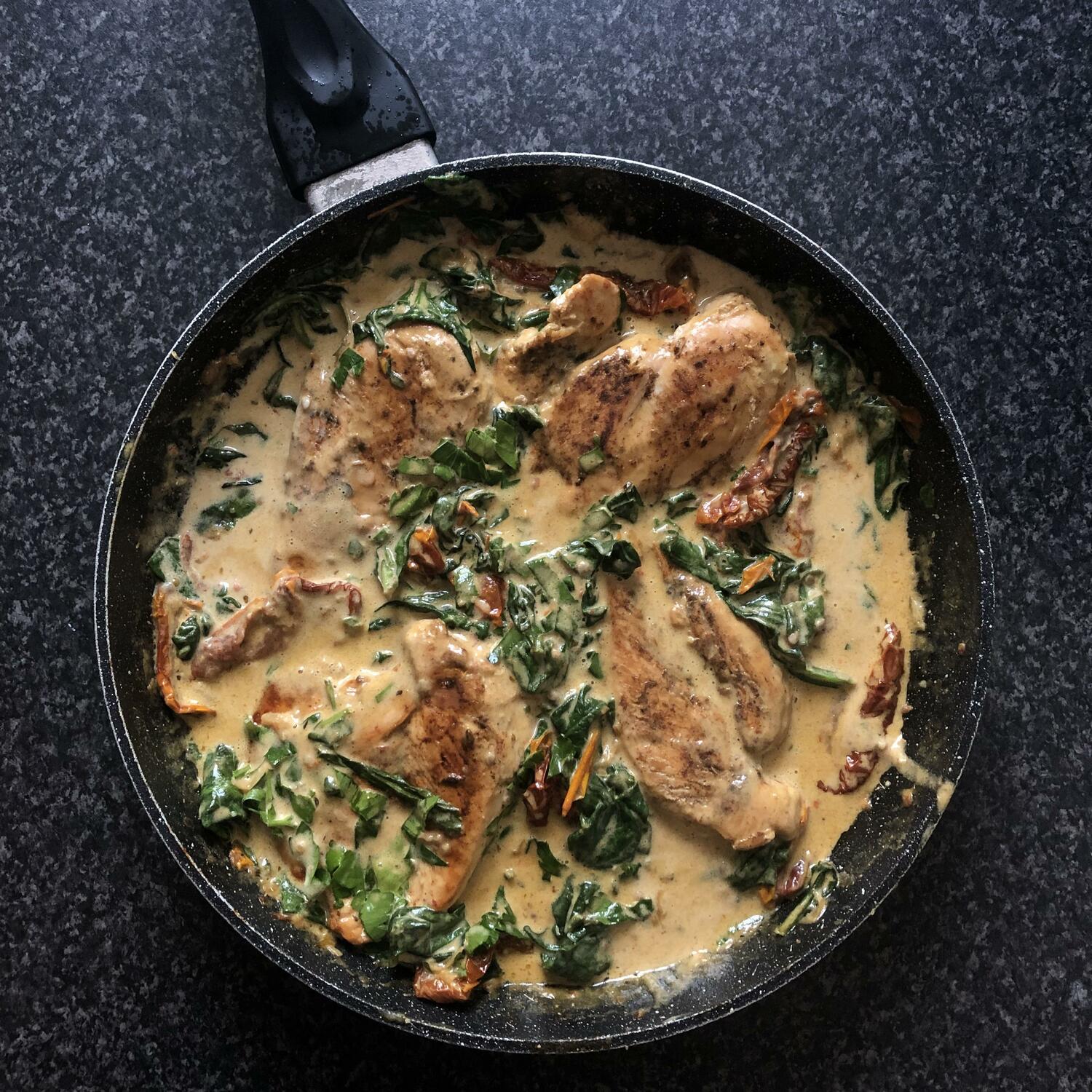 Season the chicken with the salt, pepper and paprika and then sear on the pan until golden and cooked-through. Set aside.In the same pan, heat up the rest of the oil and fry the garlic for 1-2 minutes. Add the tomatoes and cook for 3-4 minutes. Add the mustard and mix it in.Reduce heat and add in the cream, cook to a gentle simmer. Add some more salt and pepper.Add the spinach and cook until the leaves are wilt in the sauce. Then add the parmesan. Cook for another 2 minutes.Add the chicken, top up with parsley and serve :)