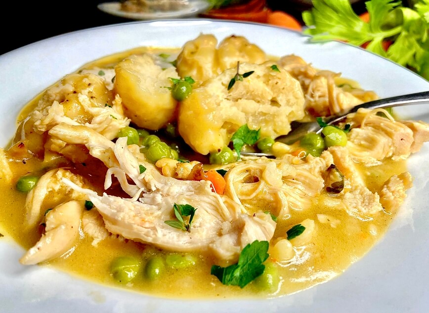 INSTRUCTIONSAdd 2 Tbsp of vegetable oil to a saute pan over low-medium heat. When the oil begins to sizzle, add the chicken breasts and brown on each side, for a total of about 10 minutes. Then, remove the chicken and set aside.In the same pan, saute onion, celery, and carrots for about 5 minutes, until they begin to soften. Add garlic and saute for 30 seconds.At this point, add butter and flour to the pan, whisk it together quickly, and then add the stock. Add the bay leaves, thyme, parsley, peas, and cream. Add the chicken back to the pan. Simmer for 30 minutes. Taste the sauce and add salt and pepper as needed.After 30 minutes, remove the chicken and using two forks, shred the chicken into bite-size pieces. Add the shredded chicken back to the pan.DumplingsIn a bowl, mix together the dry ingredients (flour, baking powder, and salt).Next, add in the heavy cream and melted butter.Mix everything together with a fork until it becomes a slightly sticky dough. Knead the dough with your hands for about one minute.Using a tablespoon, scoop out balls of dough and form them into small meatball-sized balls.Drop the dumplings into the thick sauce in the pan, making sure they’re not touching each other, as they'll puff up a bit while cooking.Cook for an additional 30 minutes.Serve in a deep pasta bowl, garnished with some fresh parsley and thyme. Enjoy!