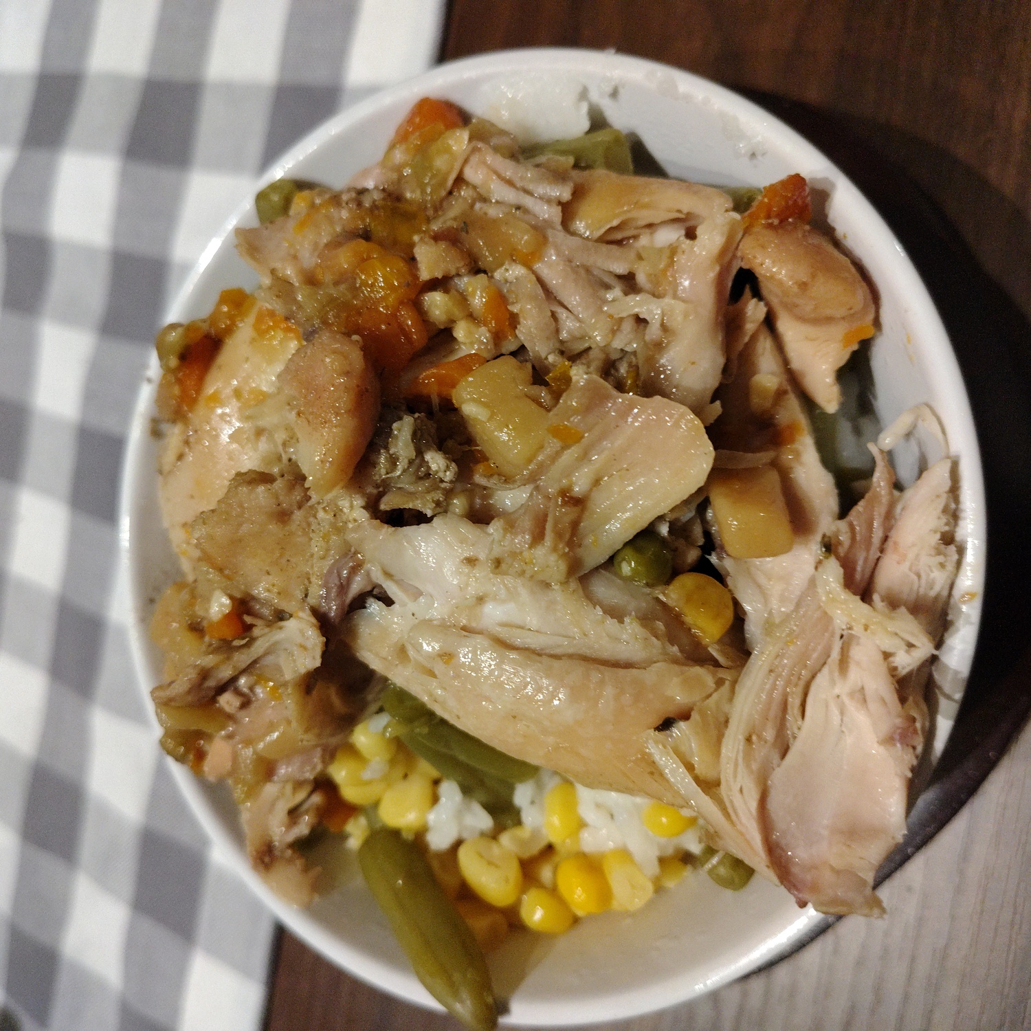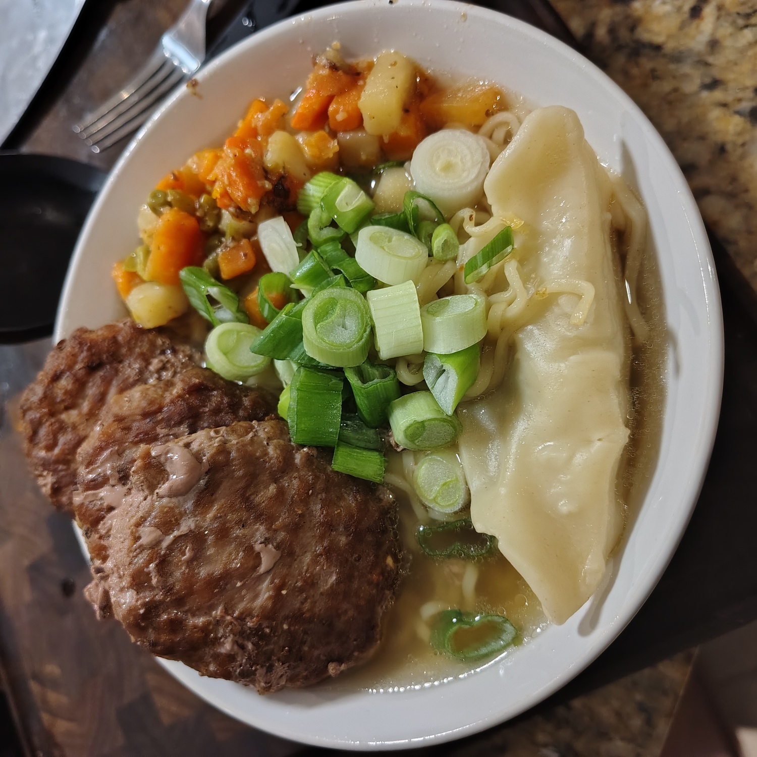beef with potstickers and mixed veg+green onion